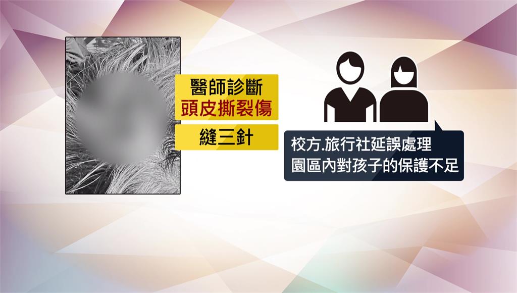學童遭人用石頭砸傷,校方、園區人員協助包紮傷口、未送醫。圖/台視新聞家長質疑,事發至今仍未找到丟擲石塊的兇手,且校方事後未主動關心傷勢,並認為樂園官方對學生安全的保護措施也有不足之處。
