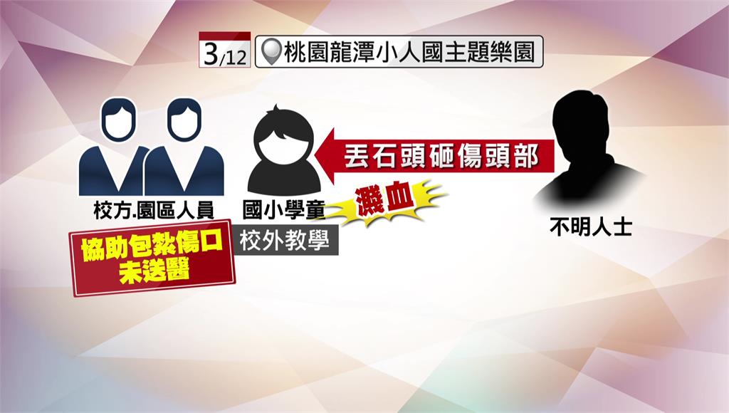 桃園市某國小到小人國進行校外教學,有學生玩遊樂設施時遭人用石頭砸傷,雖然校方及園區已協助包紮,但學生回家後,傷口仍血流不止,送醫後縫了三針。這狀況讓家長氣炸,控訴校方、旅行社以及園區延誤處理,導致小朋友的傷勢更嚴重,且事發至今仍未抓到攻擊者。