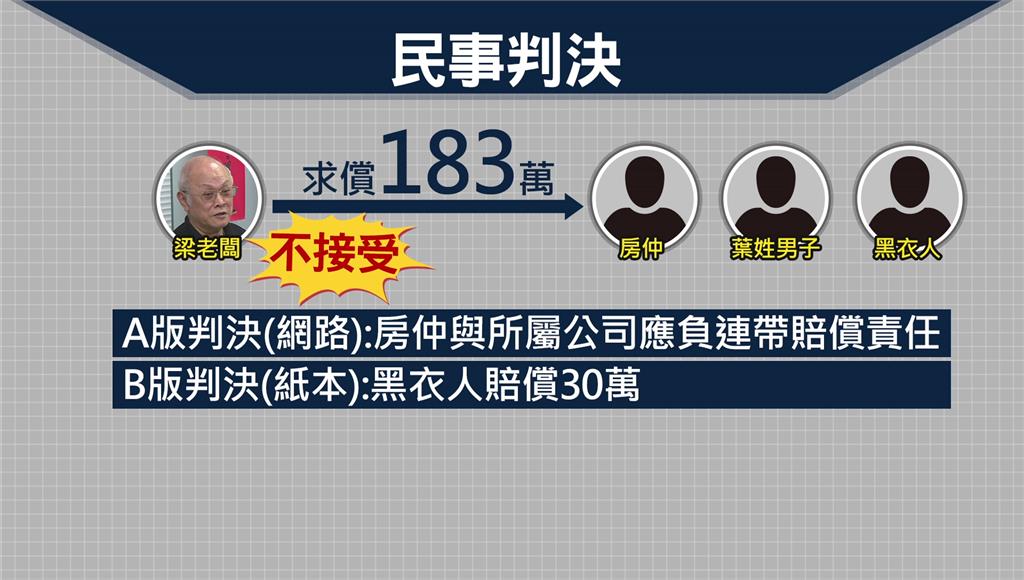 然而在民事訴訟中卻出現兩種版本判決,當時梁廣雲向房仲、葉姓男子及黑衣人求償183萬元,法院網站顯示勝訴,認定房仲與其公司應負連帶賠償責任;未料隔日收到紙本判決,內容卻不同,房仲公司被剔除,僅剩無力償還的黑衣人須賠償30萬元。