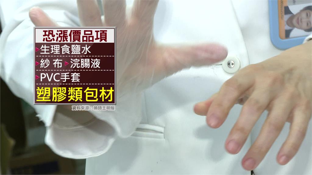 有藥師指出,生理食鹽水、紗布、浣腸液與PVC手套等塑膠類包材皆有漲價的可能。圖/台視新聞藥界希望政府介入,穩定藥廠的包材貨量,避免進一步造成藥價波動,甚至引發缺藥潮。