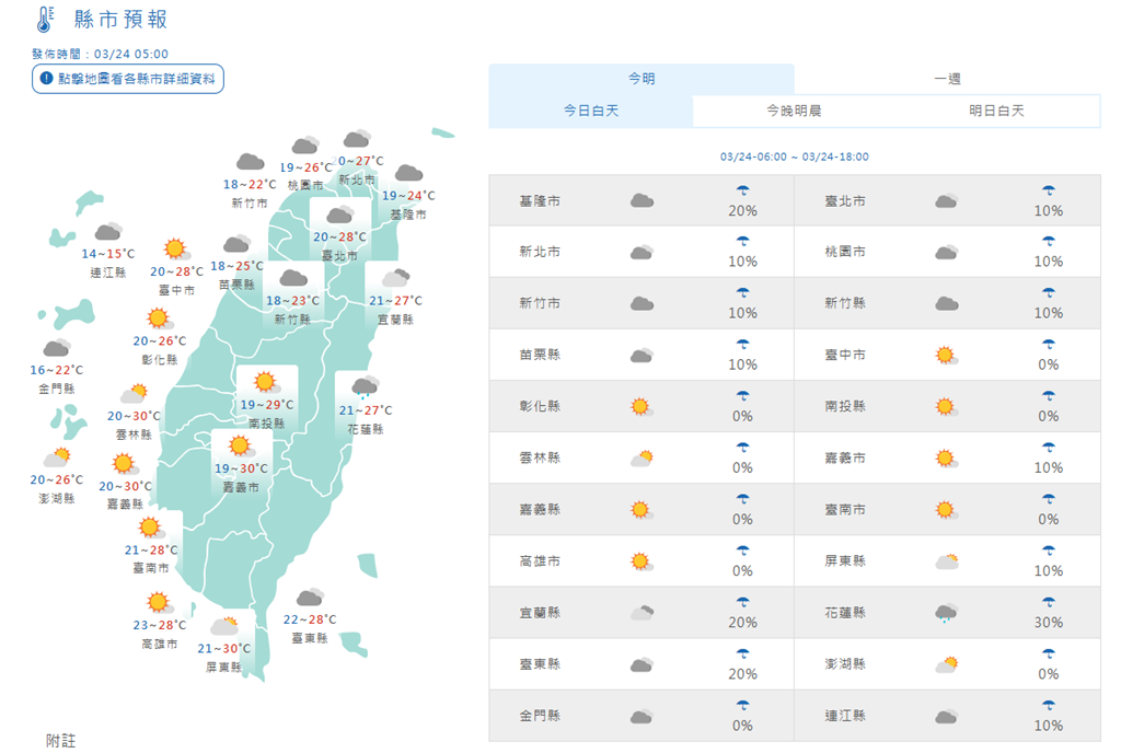 3/24全台天氣預報。圖/中央氣象署林得恩提到,明天天氣受微弱春雨鋒面通過及隨後的東北季風增強跟進南下影響,迎風面的北部及東北部地區氣溫稍略下降,其他地區早晚亦轉趨涼,北部、東北部及宜花地區低溫約降回17至20度之間;而在降雨部分,大台北地區、基隆北海岸及宜花東地區都有零星短暫陣雨機會,但雨勢不大、延時不久。