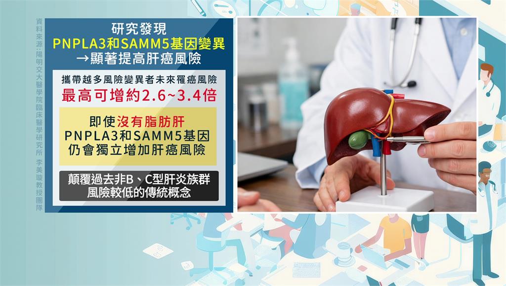 研究結果發現PNPLA3和SAMM5基因變異,會顯著提高肝癌風險,而且攜帶越多風險變異者,未來罹癌風險最高可增加約2.6~3.4倍。即使未出現脂肪肝,相關基因仍可能獨立提高肝癌風險,顛覆了過去非B型、C型肝炎族群風險較低的傳統概念。