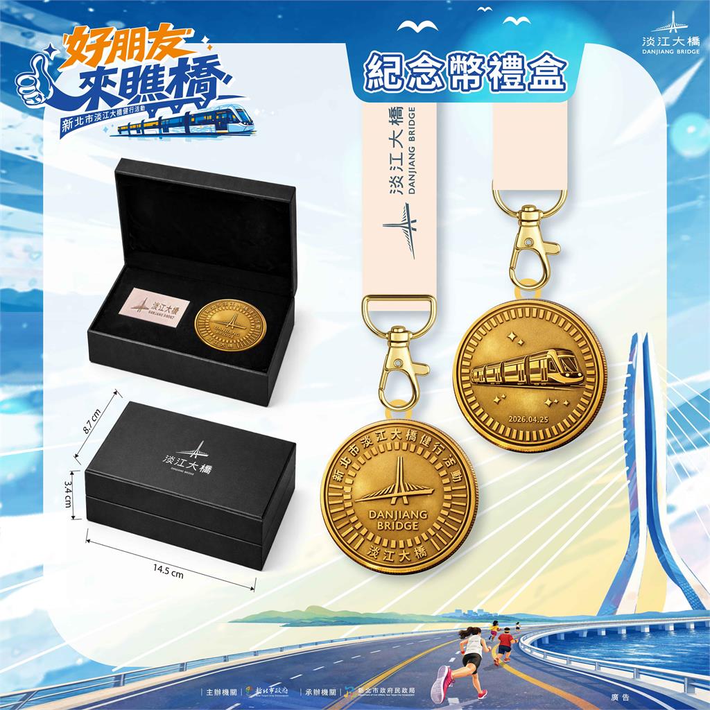 淡江大橋健行活動報名成功且完走者可獲結合橋梁與捷運意象的紀念幣。圖/新北市政府民政局提供
