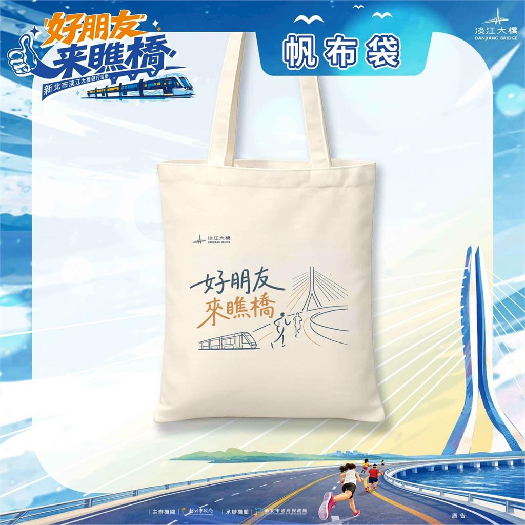 文青風帆布袋以淡江大橋與運動意象設計,兼具實用與紀念性。圖/新北市政府民政局提供