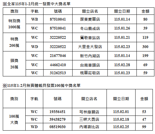 115年1至2月期統一發票今(25)日開獎,全家便利商店共有10位幸運兒抱回大獎,開獎門市橫跨新北、宜蘭、桃園、新竹、台中、台南及屏東,其中特別獎1000萬開出2組、特獎200萬開出2組、頭獎20萬開出3組,雲端載具100萬大獎開出3組。