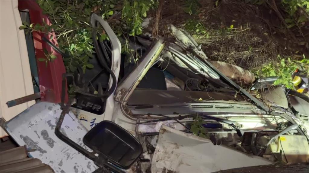 貨車車體嚴重變形,鄰近民宅及路樹也都遭到波及。圖/台視新聞貨車駕駛一度受困在嚴重變形的駕駛座內,消防人員立即出動,並動用油壓剪破壞車體,不過駕駛被救出時已無生命跡象,緊急送醫後宣告不治。受波及的住戶形容當下的撞擊聲比打雷還大聲,出來看到滿目瘡痍的現場相當傻眼,至於詳細的肇事原因,還有待警方調查釐清。