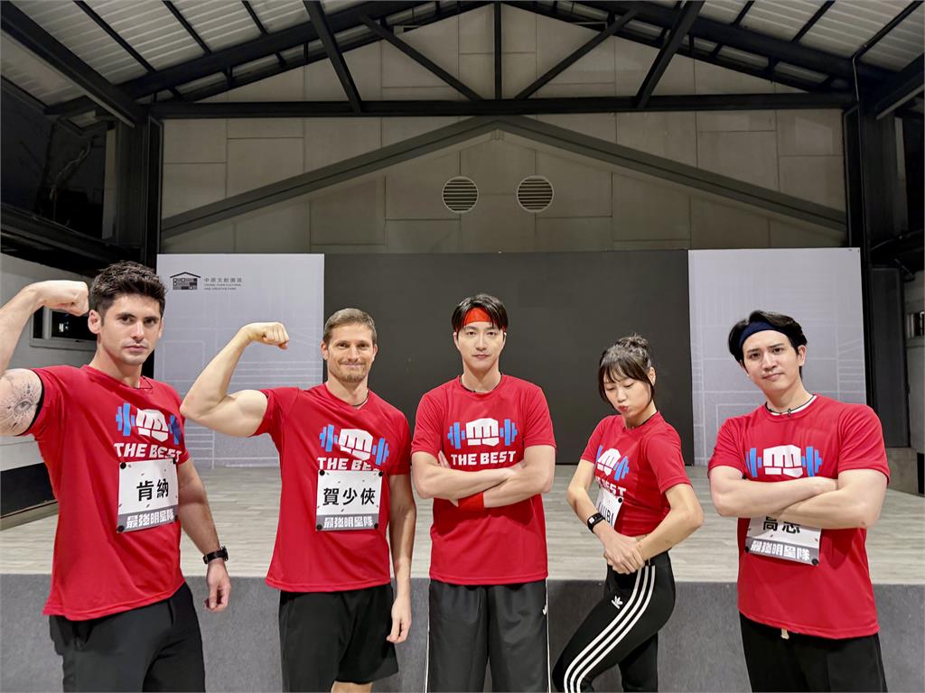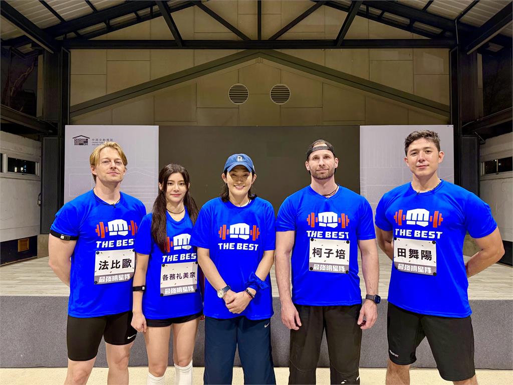 左起法比歐、各務禮美奈、錢薇娟、柯子培、田舞陽。圖/台視最終決戰來到「集貨倉接力大賽」,藍、紅兩隊隊長錢薇娟及江宏傑同時親自上陣,為榮耀與獎盃全面拚搏。在接力賽中,江宏傑主動扛下最艱難的「波比跳」項目,節奏飛快、毫不手軟,讓現場主播也刮目相看;而錢薇娟則挑戰「農夫走路」關卡,雙手各提12公斤啞鈴仍能高速衝刺,驚人爆發力讓全場看傻眼,也徹底展現兩隊隊長不服輸的強烈勝負心。