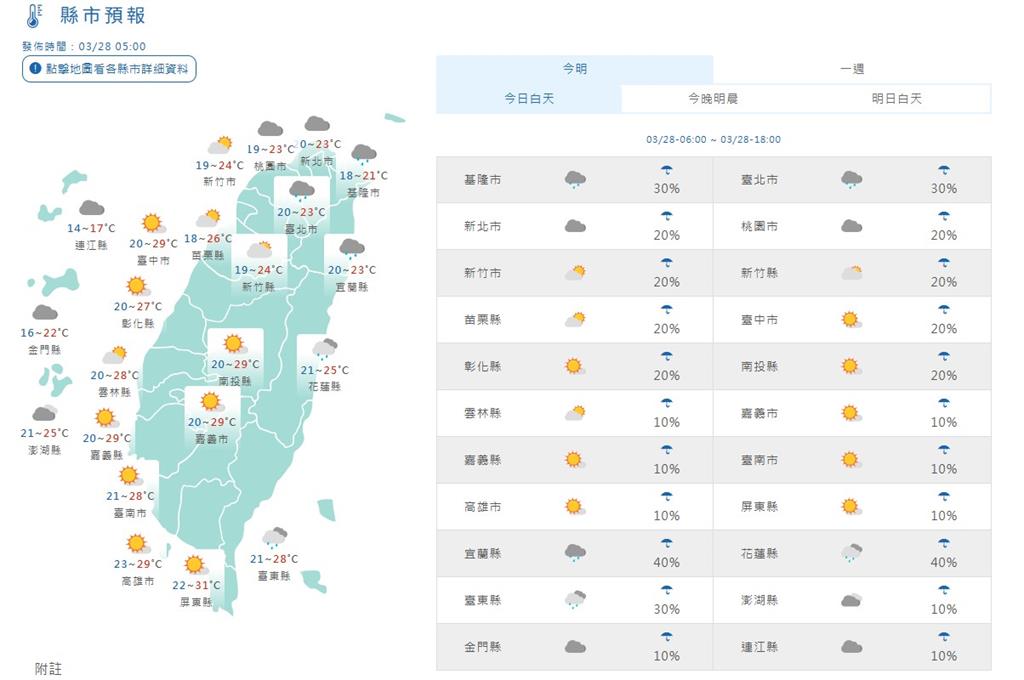 今(28)天持續受東北季風影響,整體降雨趨緩,不過水氣仍多,基隆北海岸、東半部及大台北山區降雨機率高,尤其宜花地區可能出現較大雨勢,但白天高溫仍上看30度,明天起更迎來「晴熱如夏」的好天氣。到了下週二鋒面通過各地轉雨,清明連假也將受到影響帶來雨勢,預計要到4月6日天氣才會好轉。