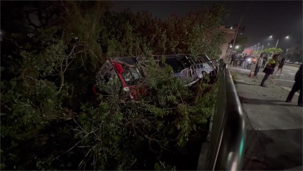 車體傾斜卡在樹林之中,車窗幾乎全數碎裂。圖/台視新聞警方獲報到場拉起封鎖線,也調派大型吊車將車輛吊掛處理,警方指出,駕駛經酒測並未酒駕,所幸車上只有駕駛與一名乘客,兩人都已自行脫困,駕駛頭部有外傷,乘客則是輕微擦挫傷,送醫後都沒有生命危險,至於詳細肇事原因,還有待進一步調查釐清。