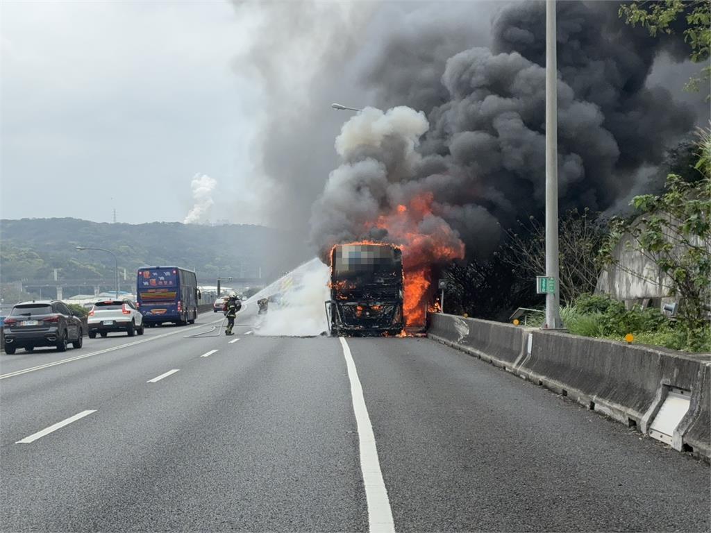 國道1號五楊高架南向45公里桃園段,今(28)日下午接近1點發生遊覽車火燒車事故,占據外側2線車道,現場交通嚴重受阻,後方車流回堵約3公里。初步了解,車內司機及乘客已全數逃生。
