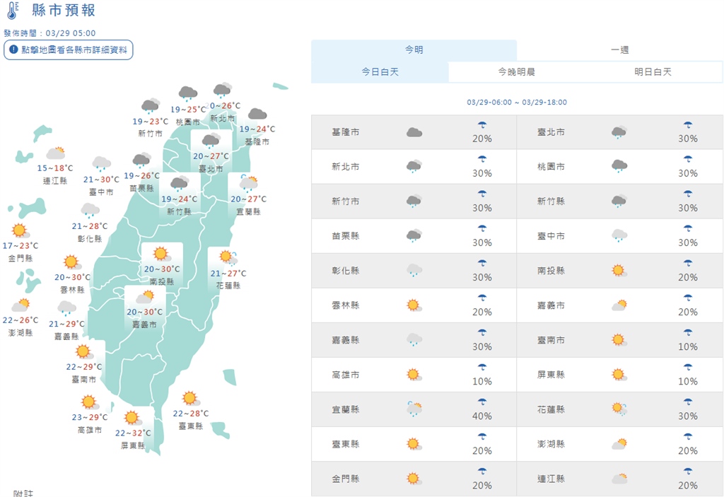 今日縣市天氣預報。圖/翻攝自中央氣象署網站氣象專家吳德榮也在「氣象應用推廣基金會」的專欄文章中提醒,依最新歐洲模式(ECMWF)模擬顯示,今日鋒面殘餘雲系減弱消散,各地多雲轉晴,中部以北小雨轉多雲,北部舒適、中南部微熱;明(30)日各地恢復晴朗穩定,天氣將「晴熱如夏」。