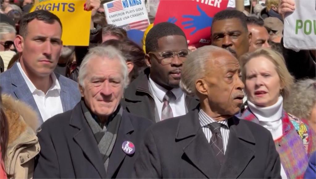 奧斯卡影帝勞勃狄尼洛現身紐約遊行隊伍中。圖/路透社、美聯社、CNN另據路透社/益普索民調顯示,川普支持度跌到36%,創下第二任期以來最低,也顯示川普重返白宮一年多來,美國社會持續分裂。