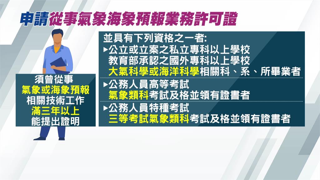 此外,氣象署指出,申請「氣象海象預報業務許可證」也有資格限制。申請人除了須曾從事氣象或海象預報相關技術工作滿3年以上,並提出證明,也必須要有大氣科學或海洋科學相關科系所畢業,或公務人員高等考試、特種考試等,須符合其中一項資格。