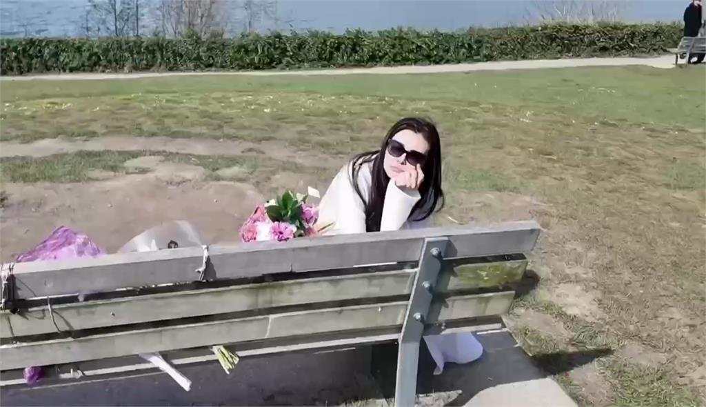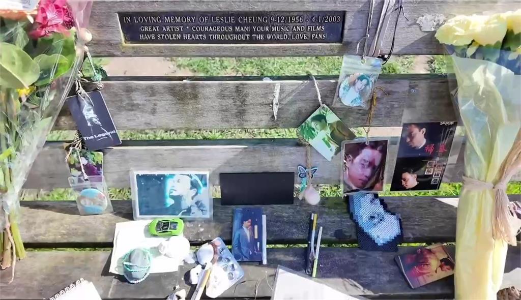 王祖賢現身於溫哥華史丹利公園「張國榮紀念長椅」,椅子上擺滿各地粉絲送來的花束與卡片。圖/翻攝自王祖賢小紅書影片中巧妙穿插兩人當年《倩女幽魂》中「寧采臣與聶小倩」初見的經典對白與唯美畫面,也收錄兩人過去出席活動、私下聚會等多張珍貴同框舊照。