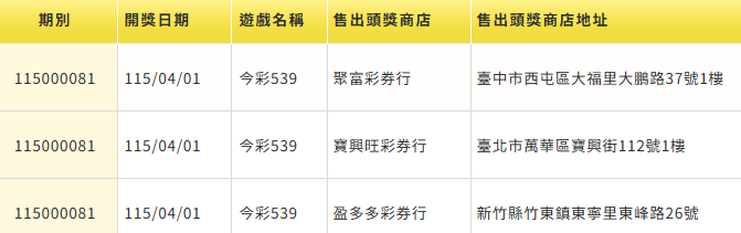 台彩。圖/台視新聞(資料畫面) 台彩今(1)日晚間派彩結果出爐,今彩539本期頭獎開出3注,800萬元大獎分別由台中市西屯區「聚富彩券行」、台北市萬華區「寶興旺彩券行」、新竹縣竹東鎮「盈多多彩券行」開出;貳獎開出279注,每注獎金2萬元。本期頭獎商店。圖/翻攝自台彩官網4/1台彩完整獎號如下:.今彩539:03、10、11、13、23。.39樂合彩:03、10、11、13、23。.3星彩:895。.4星彩:2084。確切中獎號碼及派彩結果以台彩官網公布為主。責任編輯/蔡尚晉