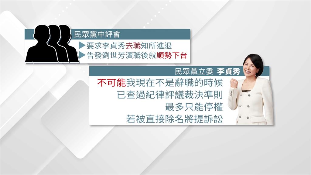 傳出李貞秀遭民眾黨中評會要求去職,李貞秀當場拒絕喊告。圖/台視新聞製圖如今有黨內公職先開第一槍,苗栗縣副縣長賴香伶發文說重話,指出李貞秀的言行已經傷害柯文哲,更引發基層反彈與質疑,望能考慮黨的生存「知所進退」,不再對外發言,並配合中評會調查;黨主席黃國昌也強調,黨中央在這件事上會用最嚴肅的態度來處理、面對,每一位公職都應該虛心地問自己,有無做到選民期待的標準,有沒有符合支持者期待的要求,展現將從嚴處理、決不寬貸的明確態度。