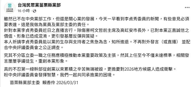 賴香伶發聲喊話李貞秀「知所進退」。圖/FB@台灣民眾黨苗栗縣黨部責任編輯/馮康蕙