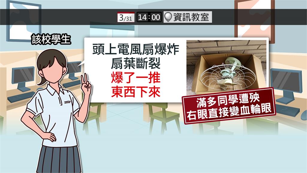 據該校學生描述,3月31日下午2點左右,她正在資訊教室做志願選填,突然頭上電扇爆炸、扇葉斷裂,灰塵與碎片一同掉落,讓許多同學遭殃,而她右眼直接變血輪眼,全班同學也被嚇傻。