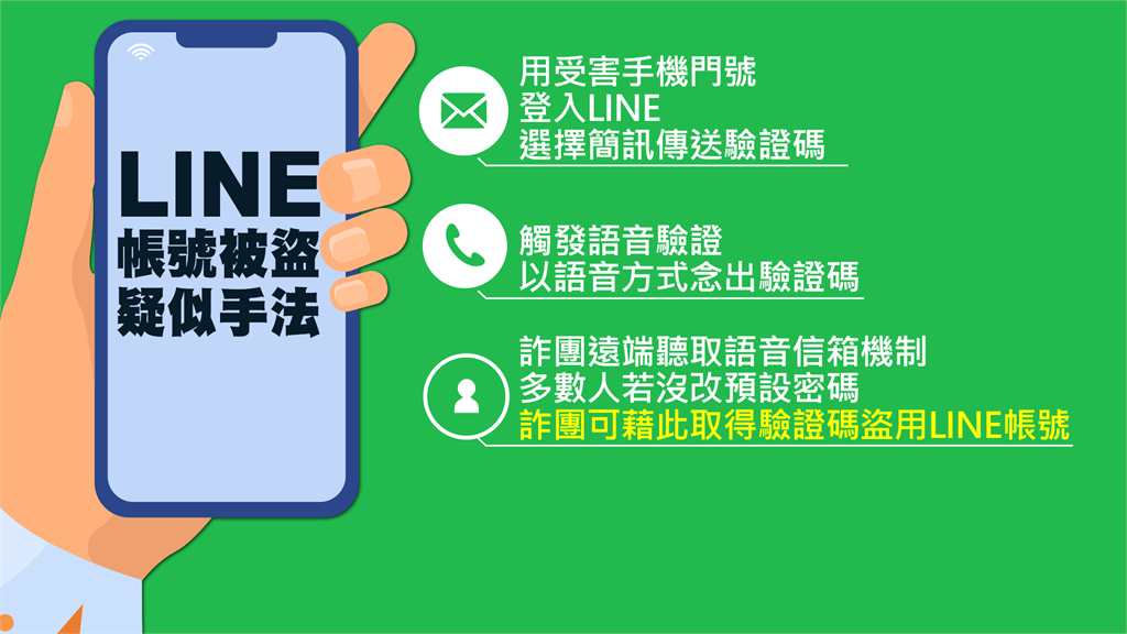 近期發生LINE帳號被大規模盜用的事件,有不少民眾遭到異常登出,專家推測,駭客應該是利用多數用戶沒有更改「語音信箱預設密碼」,直接聽取留言取得驗證碼後,再盜走帳號,但也有受害民眾表示,明明已經關閉語音信箱,LINE帳號還是被盜,而受害的大多是同一間電信業者用戶,對此業者表示,全面取消預設密碼機制,數發部也督導三大電信業者全面盤點。