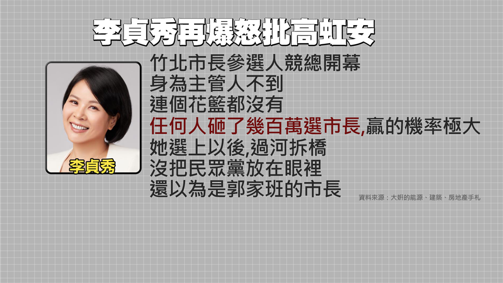 沒想到黨員再爆與李貞秀過去的對話,她可以一連罵高虹安好幾個小時,先是說「高虹安連個花籃都沒到」,任何人砸幾百萬都能選上市長,還質疑高虹安選上後過河拆橋,還以為是郭家班的市長。