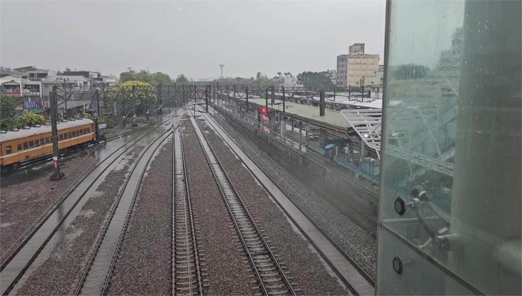 受大豪雨影響,苗栗到竹南之間的鐵路交通一度受阻。圖/台視新聞