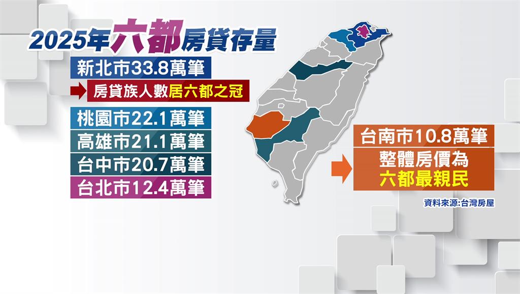 2025年六都房貸存量,由新北市以33.8萬居冠。圖/台視新聞台北/魏于恬、盧柏璁 責任編輯/陳俊宇
