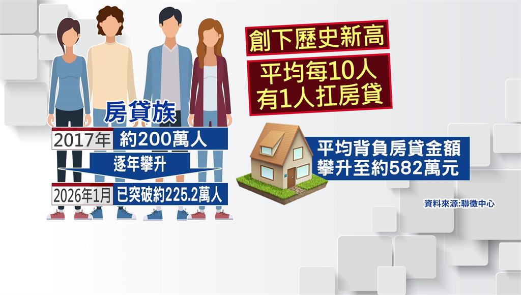 打從前年第四季開始,台灣房市正式由高檔進入到修正循環,只是房市交易急凍,房貸族卻在持續增加。根據聯徵中心資料統計,全台的房貸族,截至2026年1月為止,已經突破約225.2萬人,創下歷史新高。