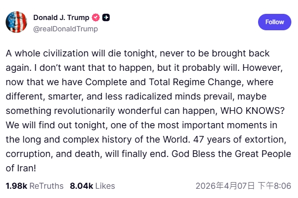 川普發文預告將有一個文明徹底消失。圖/翻攝自truthsocial@Donald J. Trump川普強調,今晚大家將見證這一切,「這將是世界漫長而複雜的歷史中最重要的一刻,長達47年的勒索、腐敗和死亡終將終結」,並在文末替伊朗祈禱,「願上帝保佑偉大的伊朗人民」。
