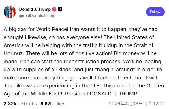 川普在社群平台上發文喊「世界和平的日子」,並指出美國會協助疏導荷姆茲海峽通行,「巨額資金將流入伊朗,伊朗可以開始重建進程」。