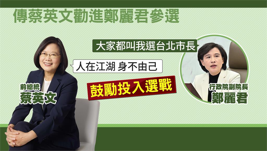 鄭麗君傳近來兩度和前總統蔡英文碰面,原本是因被勸進參選台北市長,而向蔡英文吐苦水,沒想到卻被蔡英文用「人在江湖,身不由己」8字,鼓勵投入選戰;而另一位可能人選沈伯洋,則被選對會認為要適時翻轉人設、多談市政。
