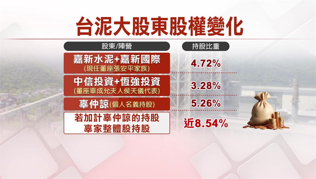辜仲諒入股台泥成最大股東。圖/非凡新聞對於辜仲諒投資動作,台泥強調對認同公司策略者保持開放態度,但辜仲諒這次投資一舉改寫台泥的股權格局,依照2025年4月揭露資料來看,現任董座張安平家族、嘉新水泥與其子公司持股合計約4.72%,原先的第二大股東,為台泥前董座辜成允夫人侯天儀代表的中信投資與恆強投資,這次辜仲諒持股5.26%,如果再加上過去辜家持股,等於整體股權逼近1成。
