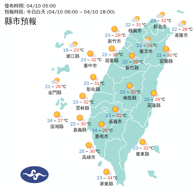 針對今日天氣詳情,氣象署說明,水氣偏少,環境風向為西南風,各地大多為晴到多雲,僅午後山區有零星短暫陣雨;氣溫方面,白天溫暖偏熱,各地高溫約29至34度,應留意台南、屏東近山區處或河谷會有局部36度以上高溫發生的機率,而西南風過山沉降增溫,台東將有焚風發生的機率。