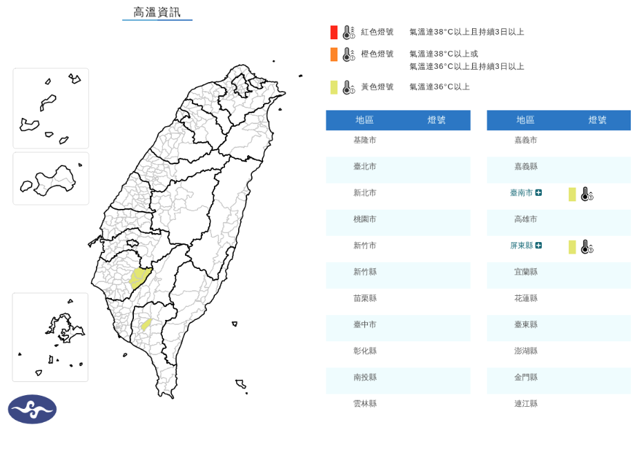 今日縣市天氣預報。圖/翻攝自中央氣象署網站氣象署也發布高溫資訊,今天中午前後台南市、屏東縣為黃色燈號,氣溫達36度以上,提醒民眾中午前後紫外線偏強,可達過量甚至危險級,外出請做好防曬並多補充水分。