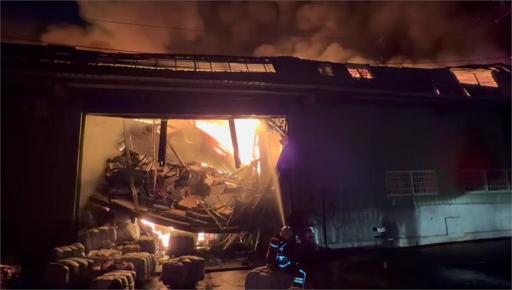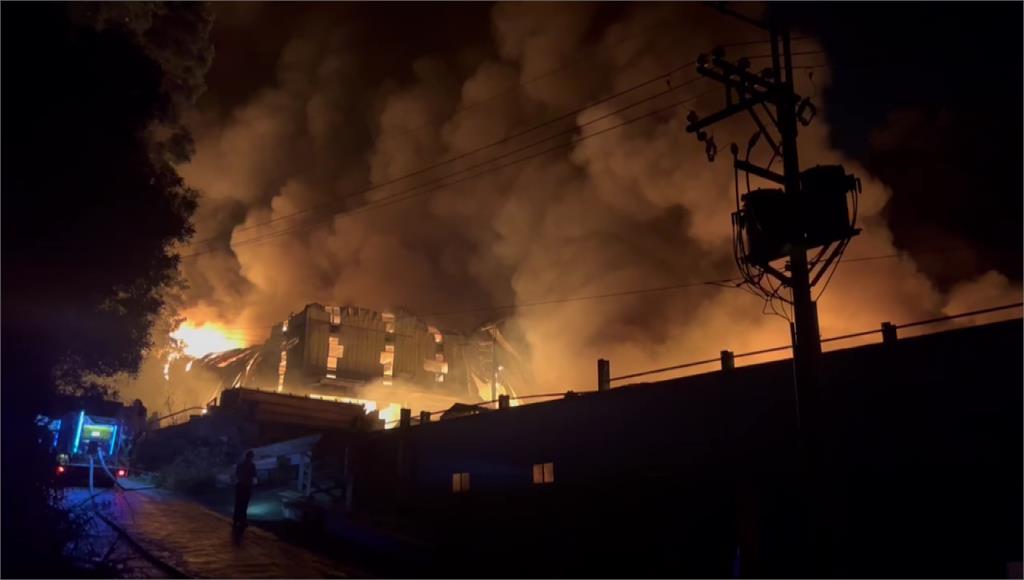 新北五股舊衣工廠發生大火。圖/台視新聞 新北市五股區民義路二段一間舊衣工廠今(12)日晚間發生火警,消防隊於晚間8時14分獲報趕抵現場時,鐵皮工廠已全面燃燒,立即佈署水線進行搶救。初步了解,現場為3間連棟鐵皮工廠,目前已有2間起火燃燒,所幸人員均已順利逃出,未傳出受困情形,詳細起火原因仍待進一步調查釐清。消防獲報到場時,2連棟鐵皮工廠已全面燃燒。圖/台視新聞責任編輯/蔡尚晉
