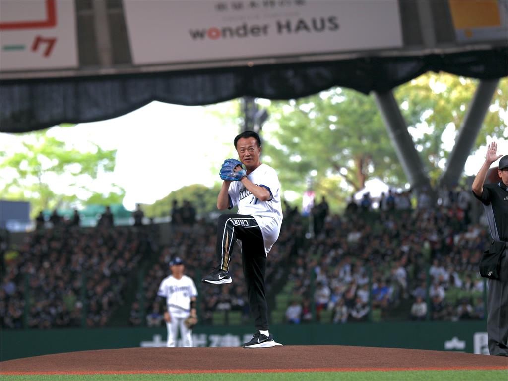 當天賽事由翁章梁擔任開球嘉賓,身穿特製球衣登投手丘,成功將嘉義農產帶進日本職棒殿堂。圖/嘉義縣政府提供