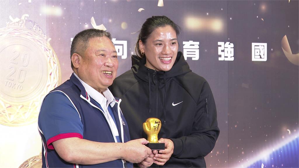 舉重國手郭婞淳準備超大自製金牌。圖/台視新聞近期也有好表現的拳擊國手陳念琴,也準備了金色拳擊手套出席,她在亞洲拳擊錦標賽女子65公斤級以4比1擊敗北韓選手奪金,進帳個人生涯第2面亞錦賽金牌;另一位奪牌選手黃筱雯則在女子54公斤級收下一面銀牌。