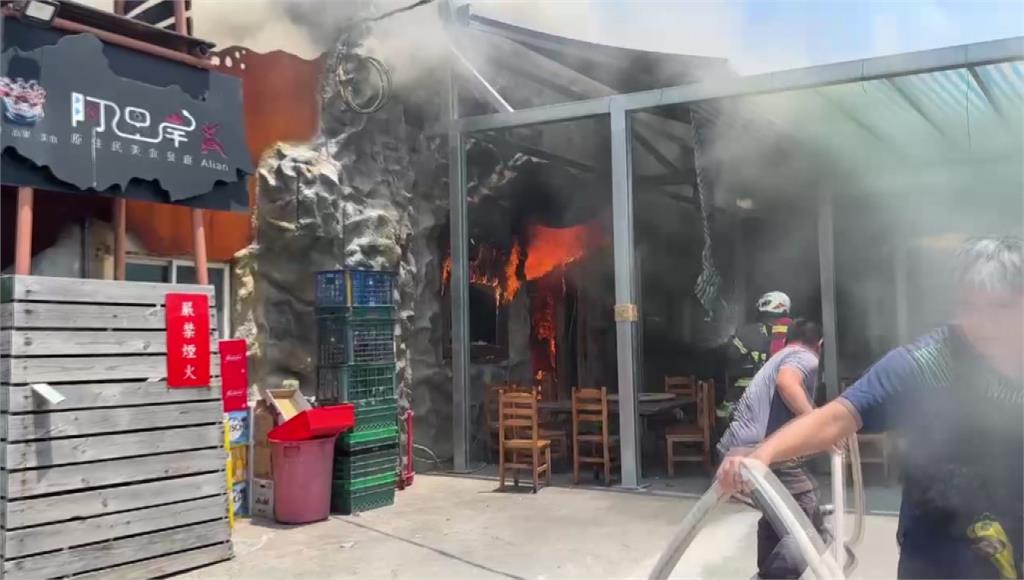 台東市臨海路一間知名原住民風味餐廳發生火警。圖/台視新聞消防局獲報後立即佈水線灌救,迅速壓制火勢,約半小時內成功控制,所幸餐廳當天無營業,現場沒有人員受困受傷。至於詳細起火原因仍有待消防單位進一步調查釐清。