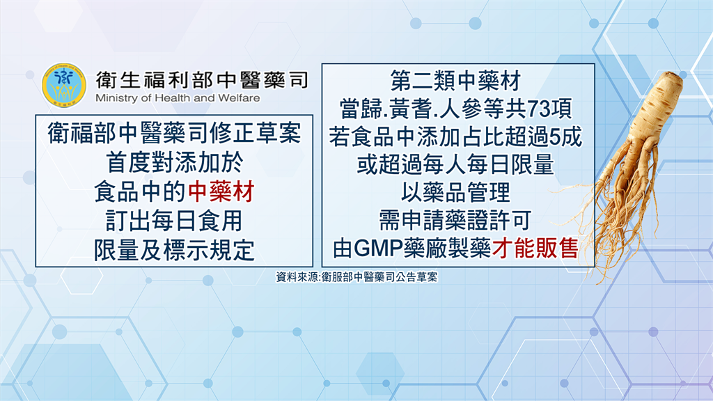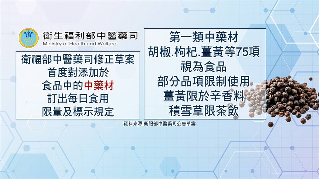 為了避免民眾誤以為具有療效,甚至讓患者延誤就醫,衛福部中醫藥司公告修正草案,首度針對添加於食品中的中藥材,訂出「每日食用限量及標示規定」,將中藥分為兩大類。