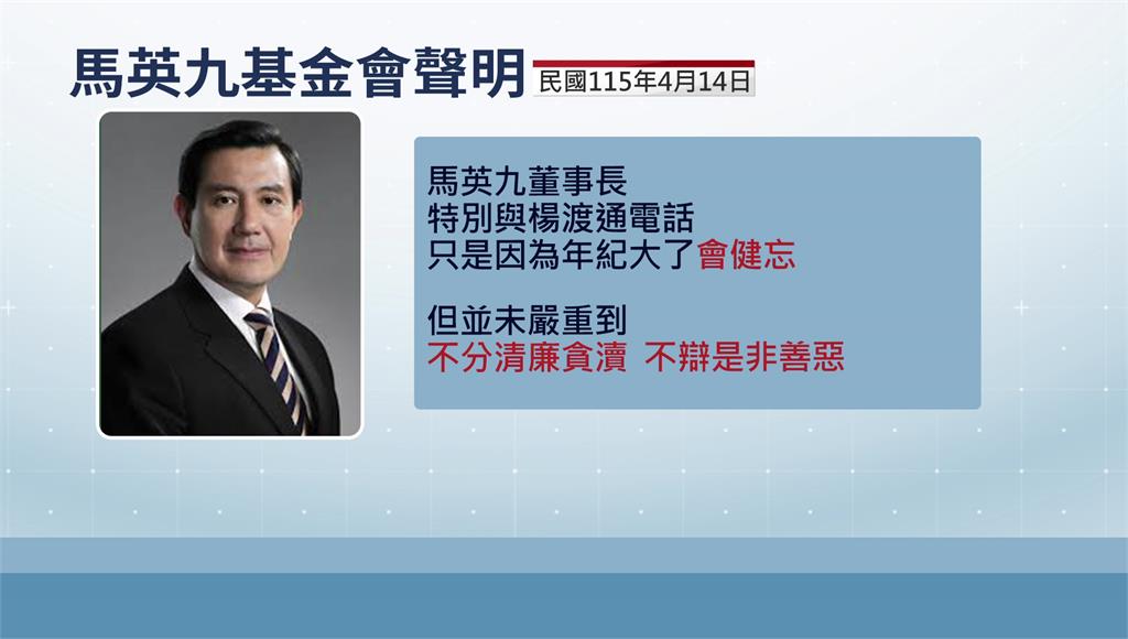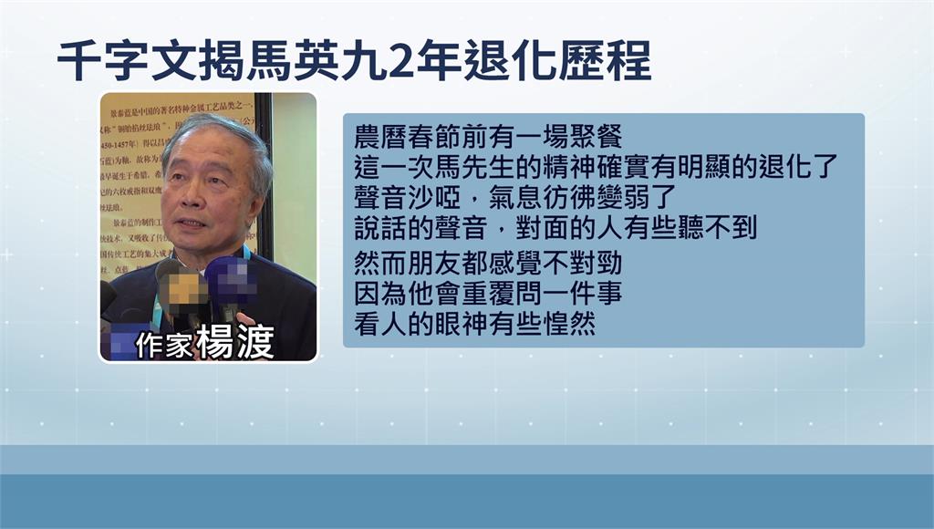 楊渡憂心馬英九身體狀況。圖/台視新聞馬英九則透過基金會表示,已與楊渡通了電話,還強調自己是因為年紀大「有點健忘」,但沒有嚴重到不分清廉貪瀆、是非善惡,並坦言無法接受蕭旭岑以「失智」為藉口,掩蓋不該做的事。馬英九也強調自己的健康情況,與蕭、王兩人是否涉及背信、侵占是兩碼子事。