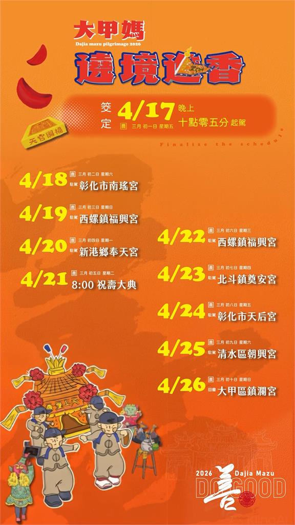 為期九天八夜的大甲媽祖遶境進香活動,廟方估計參與人次預估突破600萬,信徒們將跟隨媽祖鑾轎,一步一腳印,徒步橫跨台中、彰化、雲林、嘉義,全程超過三百公里。今年廟方也將遶境主題設定為「善」,期盼信徒們感受在地人情味的同時,也能回饋善意,讓整個遶境活動更圓滿。