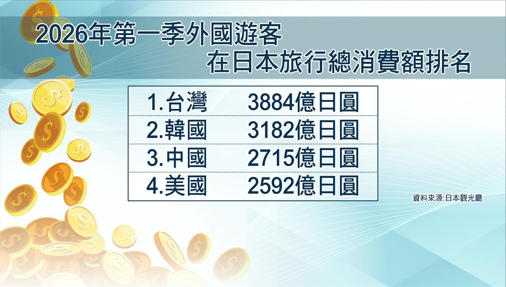 日本第一季外國旅客赴日消費統計,台灣旅客以3884億日圓居全球之冠。圖/台視新聞