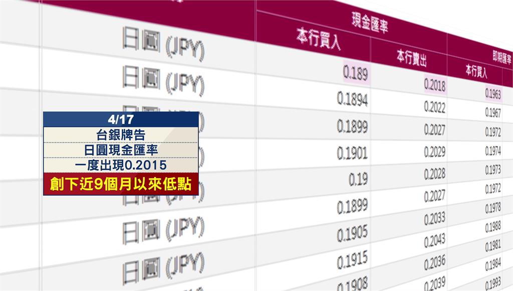 日圓現金匯率一度出現0.2015,創近9個月以來低點。圖/台視新聞