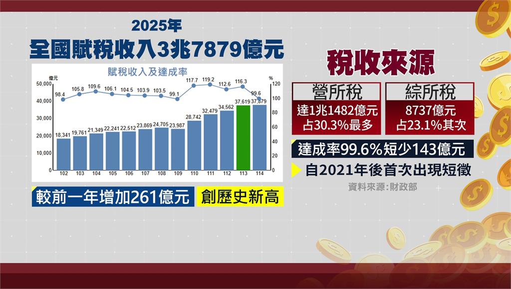 稅收來源排名,第一名是「營所稅」、其次是「綜所稅」。圖/台視新聞不過全年賦稅達成率99.6%,短少143億元,也是自2021年後以來首次出現短徵。財政部分析,去年稅收受多重因素交互影響,營所稅和綜所稅受惠於盈餘分配,與薪資所得扣繳稅款增長。但也受到車市買氣不佳、房市交易清淡,其中缺口最大的是營業稅,短徵319億元,貨物稅也短徵255億元,牽動整體稅收成長動能。
