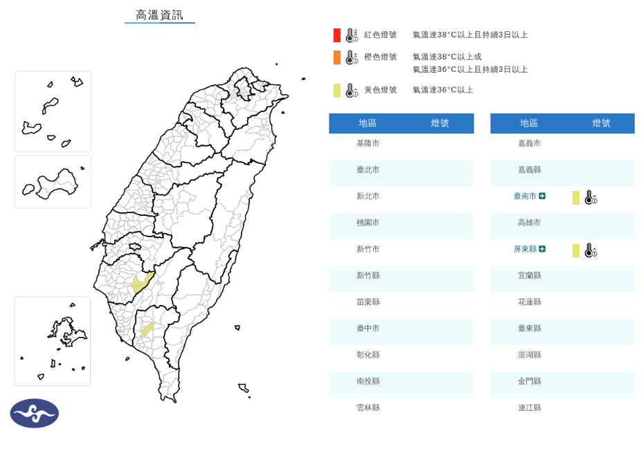 氣象署發布高溫資訊指出,中午前後台南市、屏東縣為黃色燈號,氣溫達36度以上。圖/翻攝自中央氣象署網站根據中央氣象署資料,今天花東地區及恆春半島偶爾有局部短暫陣雨,宜蘭山區及午後高屏地區、中南部山區也有零星短暫陣雨。
