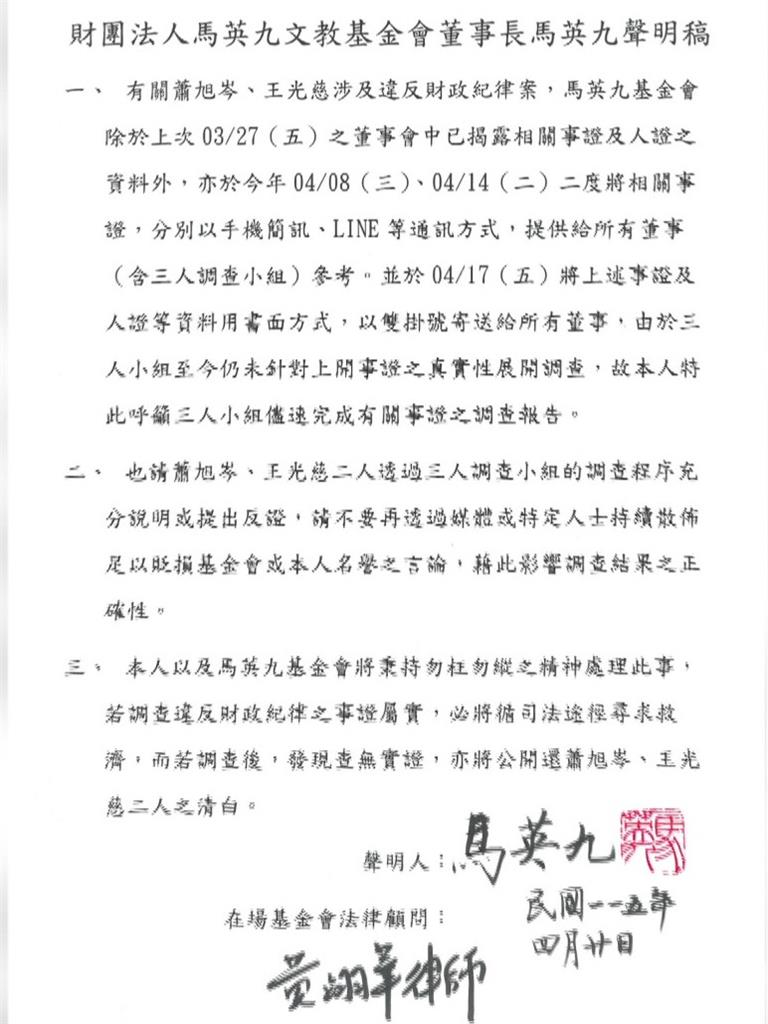 馬英九指出,針對蕭旭岑、王光慈涉及違反財政紀律一案,基金會已於3月27日董事會中揭露相關事證與人證資料,並於4月8日、4月14日兩度透過手機簡訊及LINE等通訊方式,將相關資料提供給所有董事(包含三人調查小組)參考;另於4月17日以書面形式,透過雙掛號寄送上述事證與人證資料給全體董事。