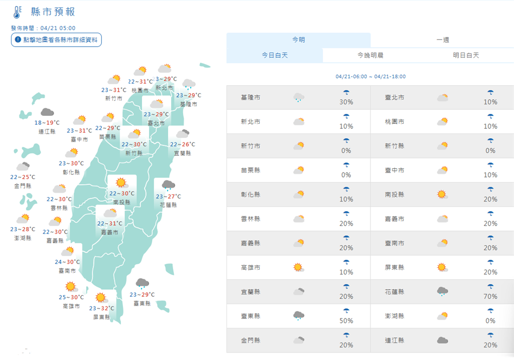 4/21全台天氣預報。圖/翻攝自中央氣象署