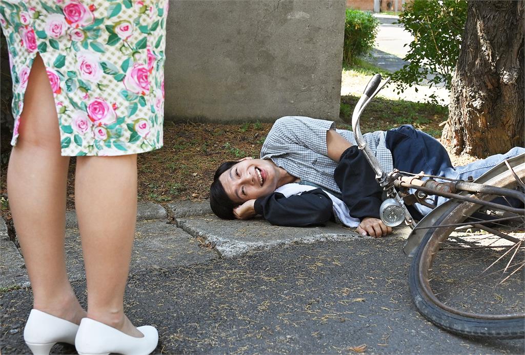 劇中逸祥飾演的「米頭」摔車後還躺在地上傻笑不止,畫面令人莞爾。這一幕正好被飾演「碧霞」的蔡宜君撞見,只能無奈上前幫忙。劇中對太太呵護備至的「米頭」,一遇到美腿瞬間破功,喜感十足。