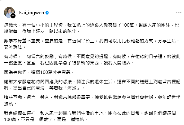 蔡英文透露,這些互動、留言、聲音,對自己來說都很重要,讓她能夠繼續與台灣社會對話,與年輕世代接軌。承諾以後也會繼續在Threads上,和大家一起關心生活的土地、關心彼此的日常。「謝謝你們讓這個100萬,不只是一個數字,而是一種連結」。