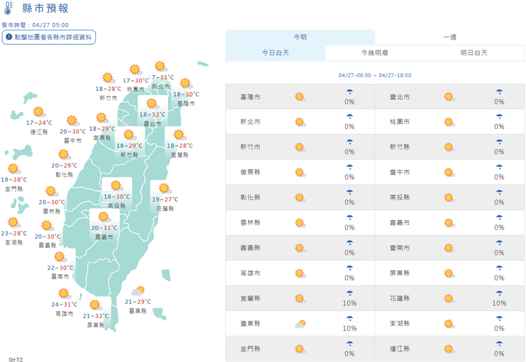 今日縣市天氣預報。圖/台視新聞展望本週天氣,氣象署指出,今明(27、28日)天氣較穩定,西半部晴到多雲,僅午後山區有零星陣雨;27日花東及恆春半島有零星陣雨,28日東半部局部短暫陣雨機率增加。澎湖、金門、馬祖今天晴到多雲,不過28日下午起逐漸轉為有陣雨或雷雨。