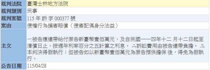全案今(28)天下午4時宣判出爐,士林地方法院宣判,被告粿粿、王子應連帶給付原告范姜彥豐新台幣100萬元,並自民國114年12月12日起至清償日止,按週年利率5%計算利息,此外訴訟費用由被告連帶負擔。至於判決書是否公開,法官認為應遮隱當事人姓名後,始予公開。
